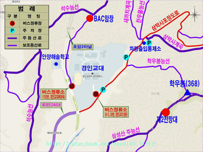 - 안양예술공원 주차장(2번마을버스종점)~서울대수목원 등산로입구~천인암능선