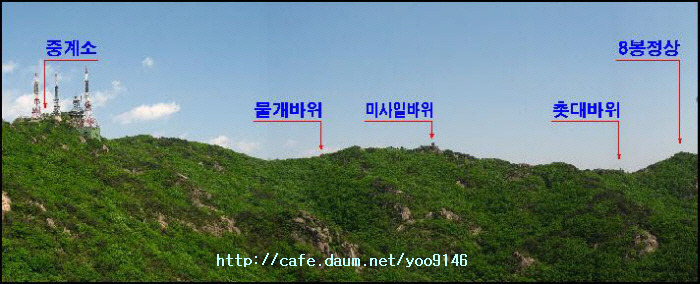 - 6봉정상~중계소 구간 : 선바위, 촛대바위, 불꽃바위, 비둘기바위, 용솟음바위, 울부짓는바위, 미사일바위,