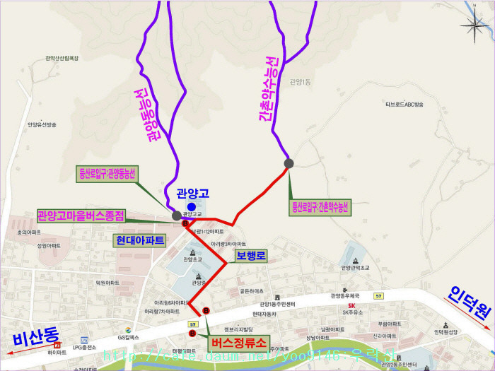 하차. 관양고, 간촌약수능선입구까지 도보로 이동한다(도보 1.2Km, 관양중학교 입구에서는 마을버스