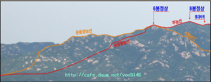 삼거리에서 6봉정상까지는 중간정도 경사의 등산로이나 중간이후는 암릉을 통과하는 급경사의 오르막구간임.