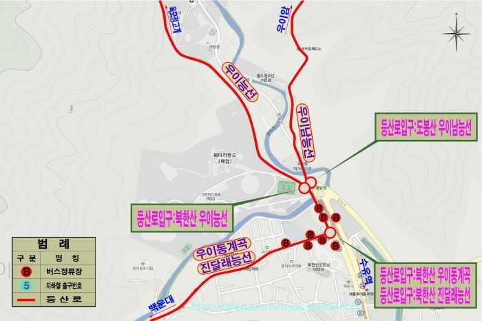 북한산 등산지도, 등산코스 및 북한산 가는 길, 가는방법 안내(우이동계곡 : 등산로입구~도선사입구~하루재~백운대코스)