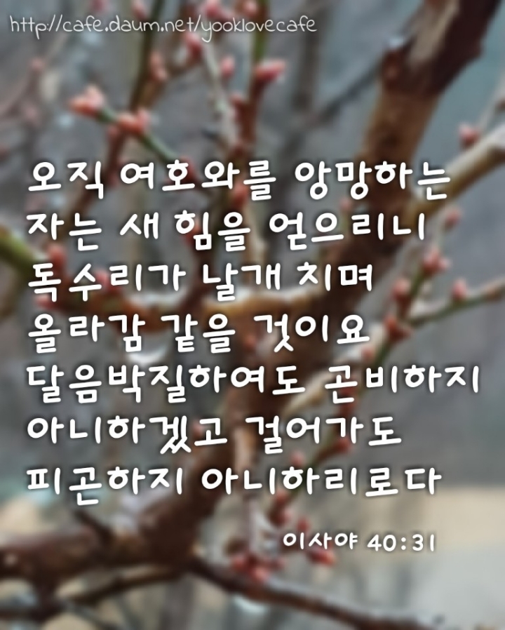이사야; 40:31 작성자하나둘셋|작성시간18.12.04|조회수18 목록 댓글 0 글자크기 작게가 글자크기 크게가 이사야 40장 31절 말씀 다음검색 현재 게시글 추가 기능 열기 북마크 공유하기 신고 센터로 신고 댓글 댓글 0 댓글쓰기 답글쓰기 댓글 리스트