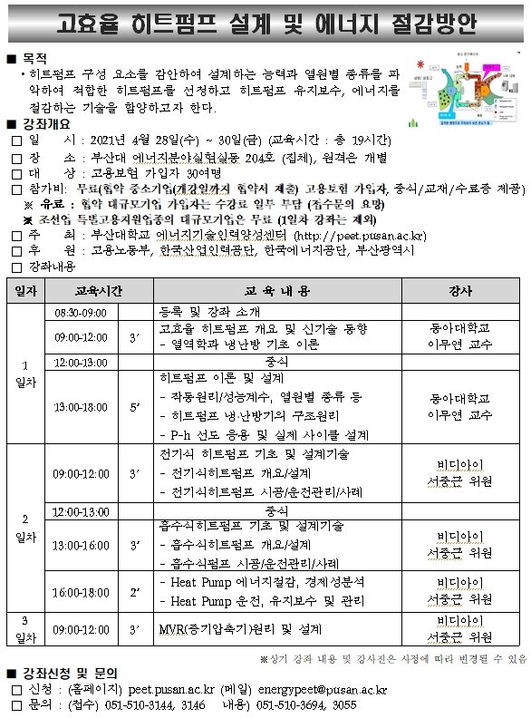 [무료교육] 부산대, "고효율 히트펌프 설계 및 에너지 절감방안" 강좌 개설 (4/28-30) 작성자우든키드|작성시간21.04.16|조회수19 목록 댓글 0 글자크기 작게가 글자크기 크게가 다음검색 현재 게시글 추가 기능 열기 북마크 공유하기 신고 센터로 신고 댓글 댓글 0 댓글쓰기 답글쓰기 댓글 리스트