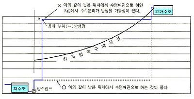 양수펌프정지시의 수주분리에 의한 워터해머의 발생은, 양수관이 그림 2.58에 나타낸 최저압력 구배곡선보다 아래에 오는 위치, 즉 양수관의 수평배관은 가능한 한 낮은 위치로 배관하여 방지한다.