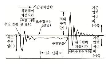 배관 내에 흐르는 물을 밸브나 수도꼭지 등에 의해 순간적으로 차단하면, 물은 운동에너지에서 압력에너지로 변하여 급격한 압력상승이 생긴다. 상승한 압력은 압력파가 되어 닫힌 지점과 상류측의 배관 내를 그림 2.56과 같이 일정시간 반복되다가 점차로 소멸한다. 이 현상을 워터해머(water hammer)라하며 심한 경우 배관계통을 진동시키거나 충격음을 발생시키며 누수의 원인이 된다. 정수압이 낮은 위치에서는 배관내의 압력이 부압이 되는 경우도 있으므로 유의할 필요가 있다.