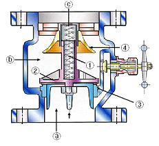 펌프가 작동을 시작하면 유체의 압력은 ⓐ를 통해 디스크 ②를 밀어 올려 ⓑ를 통과하여 출구 ⓒ로 유출한다. 펌프의 작동이 정지되면 상승압은 감소되어 역류로 전환되려는 순간(즉 흐름이 정지 된)에 스프링 ①과 완충산 ④의 조화된 힘으로 디스크 ②는 완전히 몸체시트 ③에 밀착된다. 이러한 작용에 의해 순간적으로 폐쇄되어 역류나 워터해머와 같은 현상이 발생하지 않는다. (바이패스는 항시 닫혀 있으며 필요에 따라 배수시에만 사용한다.) |