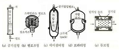 과거에는 그림 2.59(a)와 같은 공기실(air chamber)을 설치하여 충격압을 흡수하였으나, 공기가 물에 흡수되어 없어지기 때문에 시간이 경과되면 효과가 없는 것으로 알려졌다. 따라서 근년에는 그림 (b)~(d)와 같이 공기 등이 물에 흡수할 수 없도록 한 벨로즈형 또는 에어챔버형 등의 워터해머 방지기(shock absorbor)를 설치한다.
