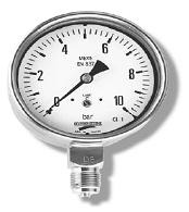 (1) 부르돈관 압력계(bourdon tube pressure gauge) : 단면이 타원형으로 된 황동관을 반원형으로 구부리어, 압력을 받으면 곡관이 탄성에 의해 늘어나 링크와 섹터의 작용으로 바늘이 움직이는 구조로 되어 있다. 주로 게이지압 98[kPa] {1kgf/cm2}이상의 고압 측정에 사용한다.