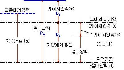 또한 압력의 표시법은 대기가 전혀 없는 진공상태(절대진공)를 기준으로 한 절대압력(absolute pressure)과, 대기압을 기준으로 한 게이지 압력(gauge pressure)이 있다. 공학상의 압력측정은 일반적으로 대기압을 기준으로 한 게이지 압력을 사용한다.