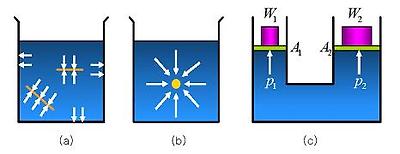 유체의 압력은 그림 1.2와 같이 접촉하는 면에 수직으로 작용하고(그림 a), 임의의 점에 작용하는 압력의 크기는 방향에 관계없이 일정하다(그림 b). 또한 밀폐된 그릇 속의 유체에 가한 압력은 모든 방향으로 균일하게 전달된다(그림 c).