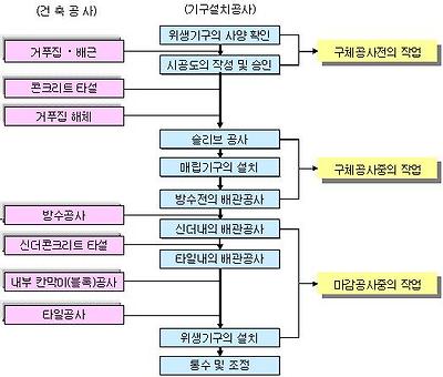 위생기구의 설치공사는 건축의 구체(軀體)공사를 할 때부터 이루어지므로, 그림 5-48과 같이 건축공정에 따라 계획을 세워서 공사를 진행시킨다.