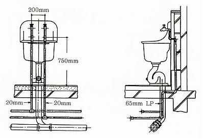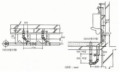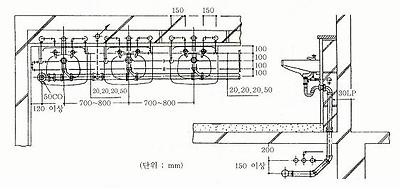 (7) 기구에 접속되는 실내 노출의 급수관, 급탕관, 세척관 및 배수관이 벽이나 바닥을 관통하는 부분에는 와셔를 설치하여 미관을 좋게 한다.