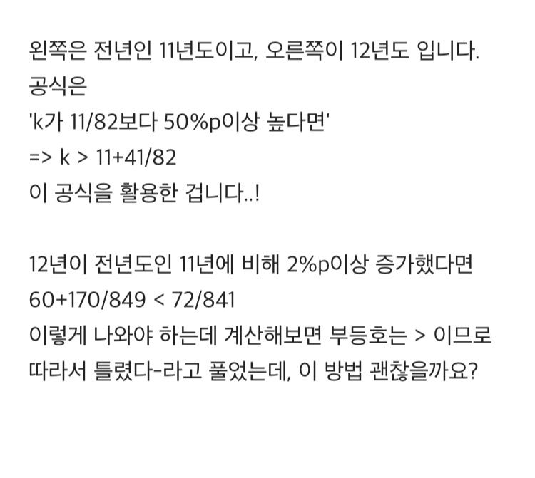 분모가 처음에는 비슷하다고 뒀는데, 저정도의 차이면 비슷하다고 봐도 되는건지 아니면 제가 두루뭉술하게 판단한것인지 궁금해서 질문납깁니다!