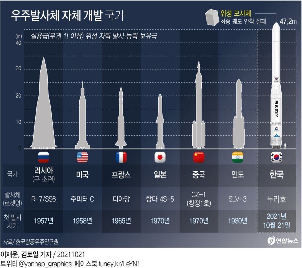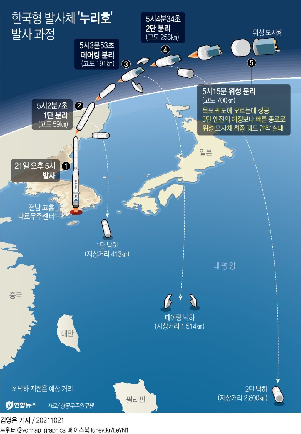 ▲... 한국형 발사체 '누리호'(KSLV-II)가 21일 오후 5시 이륙 후 1단,