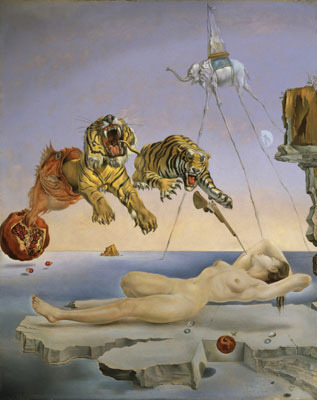 살바도르 달리의 죽을 뻔한 위험 앞에서도 청중은 언제나 성황리에 치러지는데 기여를 했고 살바도르 달리는 20세기 초현실주의를 대표하는 화가입니다. 초현실주의란 말 그대로 현실이 아닌 초 현실을 표현하는 예술사조입니다. 살바도르 달리의 작품들을 볼까요? 기억의 영속 가장 유명한 그림 '기억의 영속'입니다. 늘어진 시계들, 저 멀리는 바다 같기도 하고, 앞에는 파리 한 마리와 개미 무리들 같기도 하고, 아무튼 뚜렷하게는 알 수 없는 사물들로 화면이 채워져 있습니다. 초현실의 세계를 표현한 것 인만큼 역시 자연스럽지는 않습니다. 하지만 너무도 사실적인 표현에 보는 사람에게 충격을 주며, 관객 스스로가 무언가를 상상할 밖에 없이 만드는 작품인 것 같습니다. 잠깨기 직전 석류 주위를 한 마리 꿀벌이 날아서 생긴 꿈 제목에서 알 수 있듯이 이 그림은 잠에서 깨기 그런데 저기 누워있는 여인 보이시죠? 갈라는 살바도르 달리에게는 너무나도 중요한 사람이었습니다. 그 후 갈라는 50여년을 살바도르 달리와 함께 살면서 정신적인 존재, 영감을 주는 수호자로 달리의 삶에 존재하였습니다. 언제나 기괴한 행동을 일삼았고, 독특한 사고를 가졌던 달리 옆에서 스스로를 천재라고 외치던 달리 그는 자신이 초현실주의 자체라고 늘 말했습니다. | ||||||||