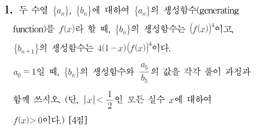 이산수학 자작문제 [2] 작성자bdfhj|작성시간26.03.21|조회수114 목록 댓글 2 글자크기 작게가 글자크기 크게가 어려운 문항은 아닌듯 합니다~ 다음검색 현재 게시글 추가 기능 열기 북마크 공유하기 신고 센터로 신고 댓글 댓글 2 댓글쓰기 답글쓰기 댓글 리스트 작성자ㅇㅇ2 | 작성시간 26.03.21 answer: {b_n}의 생성함수 (1-2x)^-2a_5/b_5=21/512 답댓글 작성자bdfhj 작성자 본인 여부 작성자 | 작성시간 26.03.22 정답입니다! 댓글 전체보기