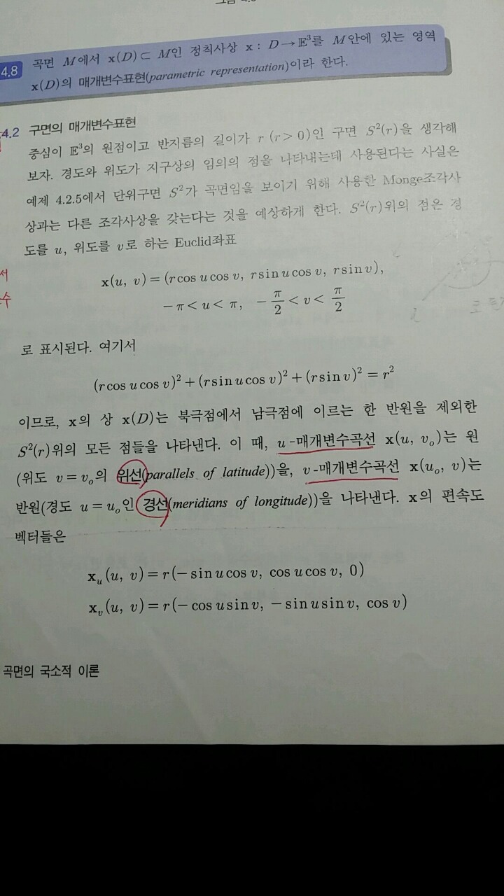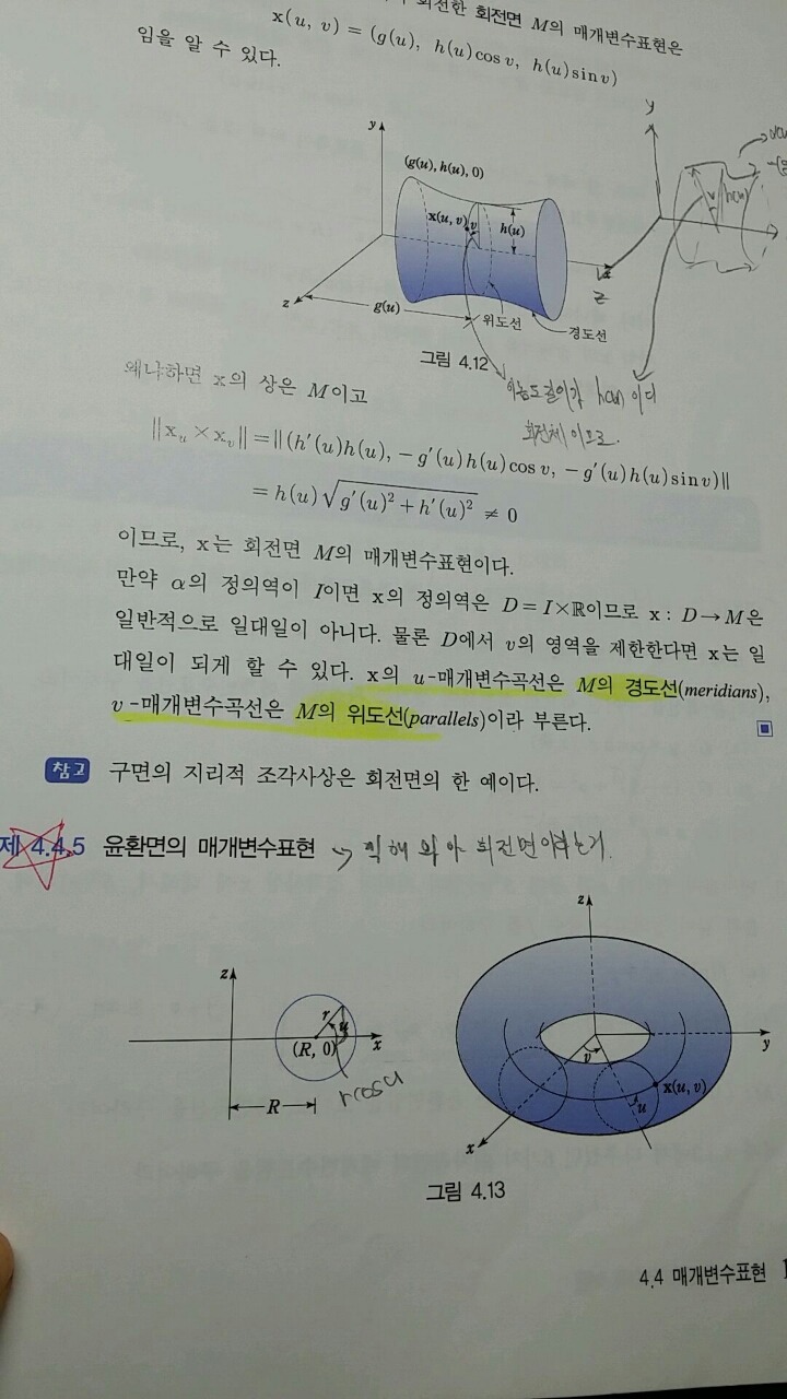 작성자스트라드 작성시간 16.03.05 일반적으로 회전면은 에 있어서 한점에 대해서 회전회서 생기는 자취(곡선)가 위선, 회전하기전의 곡선을 경선이라고 생각하면 될것같습니다.
