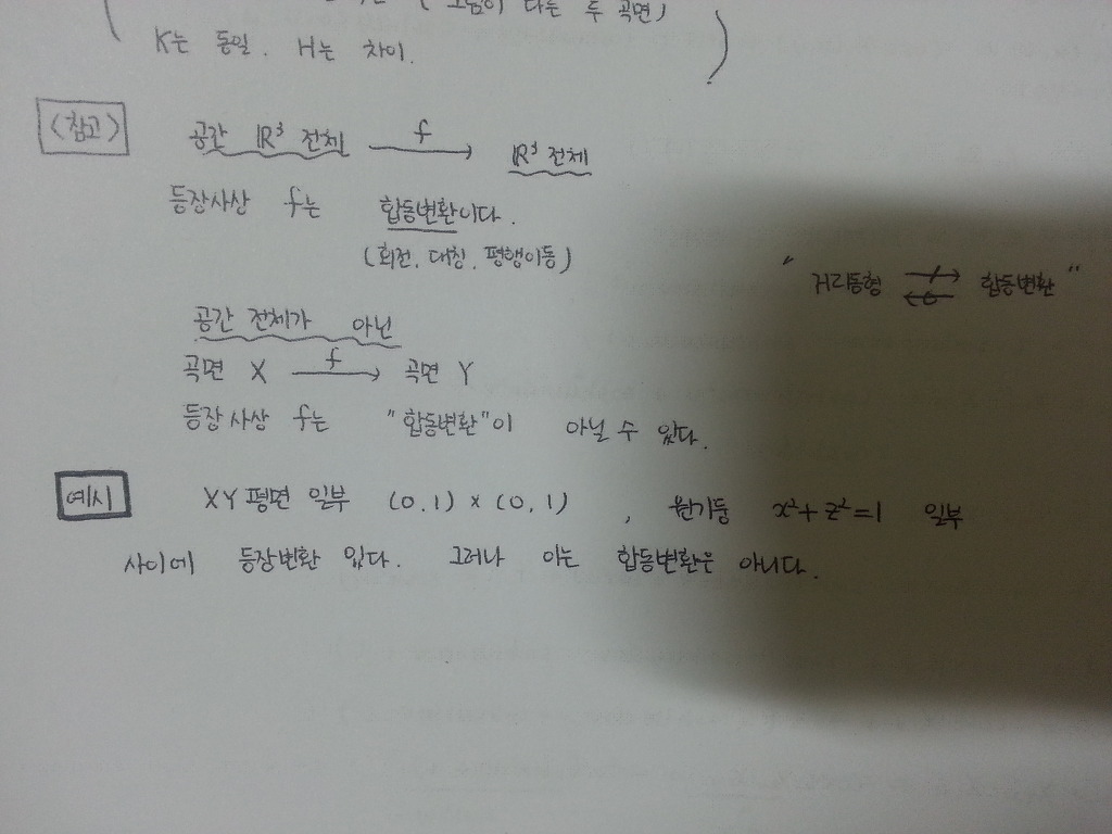 답댓글 작성자힘내라 힘!! 작성시간 13.08.27 따라서 질문하신 내용은 위 정리에 의해 설명이 되네요~ 두개의 곡면사이에 등장사상이 있는데 전체 곡면에서의 등장사상을 곡면에 맞게 축소했을때 두 개의 등장사상이 같지 않으므로 합동변환이 아니라고 한거에요~ 이제 의문이 좀 풀리실까요??ㅎ;;