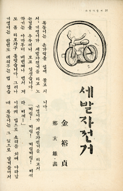 동화는 세발자전거의 주인 ‘기영’에게 ‘복동’이 자전거를 빌려 달라고 조르는 장면으로 시작한다.그러나 ‘기영’은 자전거를 빌려주지 않고 약을 올리기만 한다.보다 못한 복동의 언니가 묘수를 내어 ‘기영’을 골탕 먹이는 동안,‘복동’이 마음껏 자전거를 타는 장면으로 끝이 난다.짧은 분량에도 명료한 메시지로 완결성 또한 갖췄다.삽화는 채만식의 ‘탁류’,이태준의 ‘청춘무성’ 삽화를 그린 고 정현웅(1911∼1976년) 화백이 그렸다.
