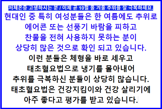 저체온증 고생하시는 분 / 이제 곧 10월 올 겨울 추위를 잘 극복하세요.