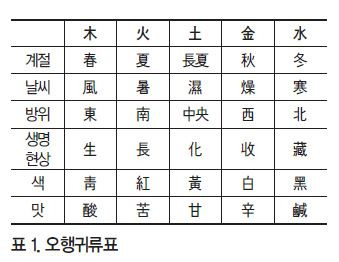 다양한 자연현상들을 오행으로 분류해놓은 표를 五行歸類表(오행귀류표)라고 한다(표1). 이 글에서는 계절, 날씨, 방위, 생명현상의 발전과정, 색, 맛 총 6가지에 대해서 오행으로 분류해 놓은 표를 소개하고자 한다.