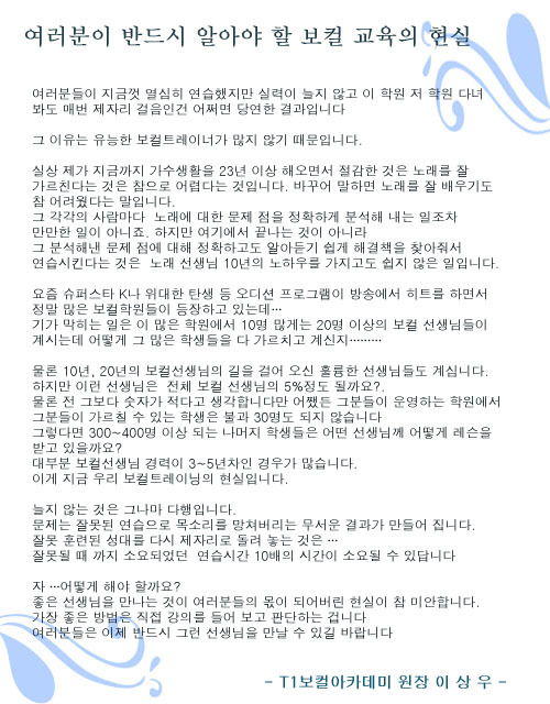 보컬학원 강의 관련된 이상우씨 칼럼 퍼왔어요..읽어보세요 작성자소랑이|작성시간11.06.03|조회수23 목록 댓글 2 글자크기 작게가 글자크기 크게가 보컬학원 검색하다가 가수 이상우씨가 쓴 좋은 글이 있어서 퍼왔습니다. 학원을 어떤 기준으로 골라야 되나 망설였는데.. 한번 읽어보세요.. 다음검색 현재 게시글 추가 기능 열기 북마크 공유하기 신고 센터로 신고 댓글 댓글 2 댓글쓰기 답글쓰기 댓글 리스트 작성자뽀뇨 | 작성시간 11.06.03 이상우씨 완전 매너남이에요 같은 교회에서 만났는데 디게 착하고 친절~ 얼굴이 넘 작아서 놀람~ㅎㅎ 작성자금요일엔 패피 | 작성시간 11.06.07 잘봤습니다~ 좋은 정보 감사해요 댓글 전체보기