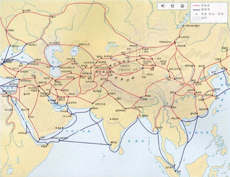 두 개의 문화권이 만날 수 있게 한 동서교통로(혹은 교역로)가 바로 비단길( 비단로緋緞路, Silk Road)이다. 비단길은 전한[前漢: B.C. 206-A.D. 8]시대 무제[武帝: 재위 B.C. 141-B.C. 87]에 의해 처음 개척되었다. 무제는 서쪽 변방을 괴롭히는 흉노족을 몰아내기 위해, 흉노족 너머 월지국과 연합하려 장건(長騫, ? ~ B.C. 114)을 파견하는데, 공교롭게도 장건은 흉노족에게 붙잡혀 10여년을 보내게 된다.
