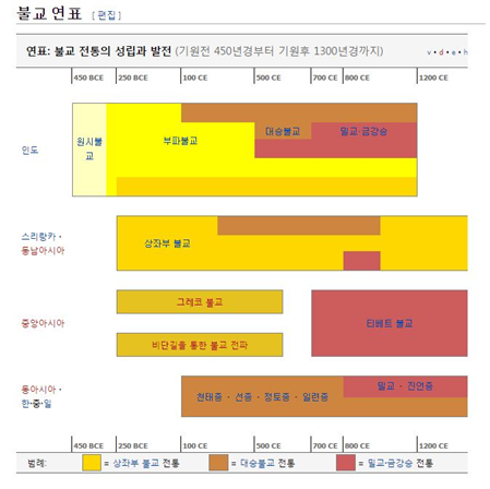 불교가 종주국 인도로부터 다른 주변 지역으로 확산된 시기는 대체로 다음 4기로 구분한다. 제 1기는 B.C. 3세기 무렵 인도 남쪽인 세일론(지금의 스리랑카)으로의 전파이고[남전南傳], 제 2기는 B.C. 1세기 무렵부터 시작된 인도 북쪽 서역西域국가들로의 전파와 중국으로의 전파다[북전北傳]. 제 3기와 4기는 7~8세기 이루어진 스리랑카 상좌부上座部 불교의 동남아시아 전파와 9세기 이후 이루어진 티베트와 네팔로의 밀교 전파를 꼽는다.