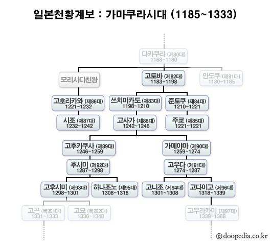 고곤은 제89대 고후카쿠사[後深草, 재위 1246~1260] 천황 계열로 90대 가메야마[亀山, 재위 1260~1274] 계열인 고다이고와는 다른 왕통이다. 교토에서 쫓겨난 고다이고는 나라[奈良]로 내려가 요시노 산지[吉野山地]를 거점으로 투쟁하는데, 다이카쿠지와 지묘인 계통의 천황 두 파가 대립하여 격렬한 싸움을 벌이게 된 것이다. 이를 남조南朝와 북조北朝, 두 천황이 이끄는 난보쿠초[南北朝, 1336~1392] 시대라고 한다. 일본의 남북조시대는 전국의 무사단이 개입한 전국적 전란으로 약 60여 년간 지속되었다.