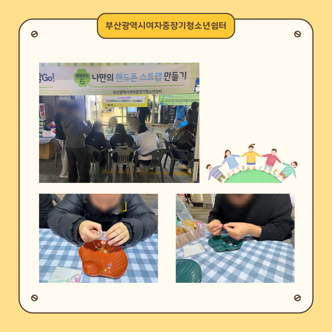 요즘 유행하는 핸드폰 스트랩 만들기를 진행하면서 쉼터가 어떤 곳인지, 무엇을 하는지 이야기를 나눌 수 있었어요.