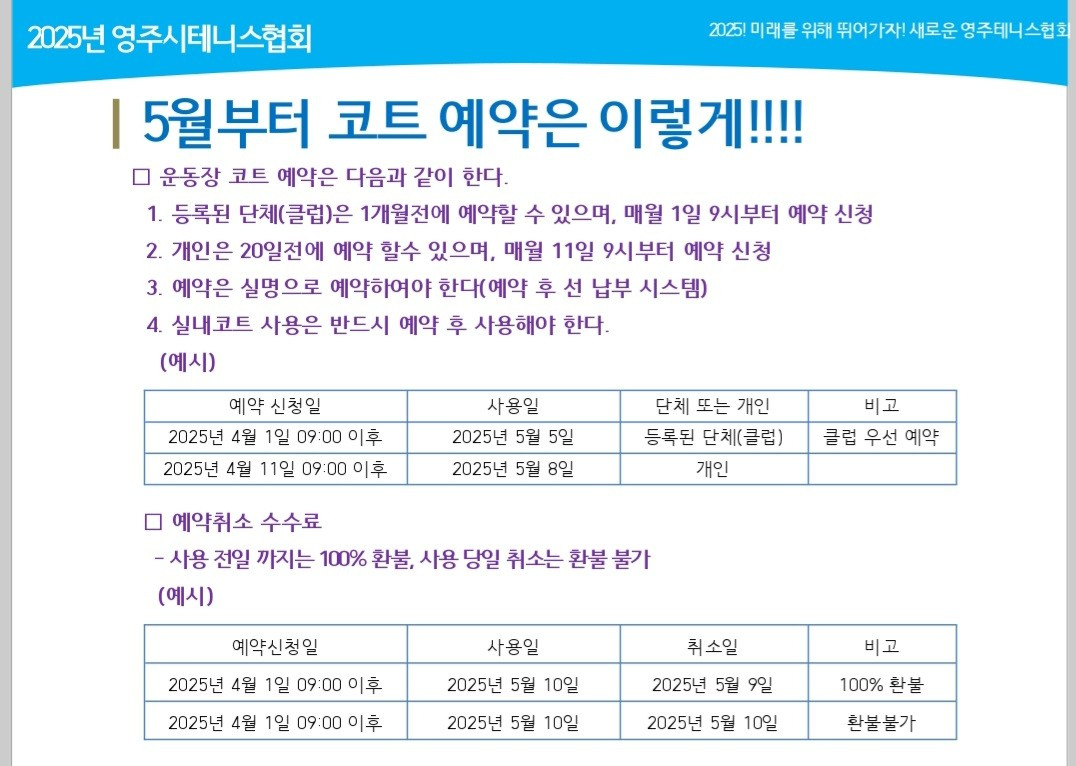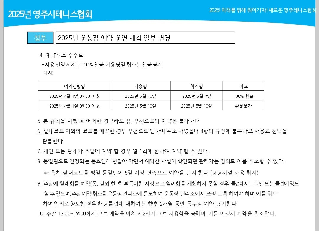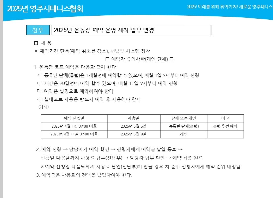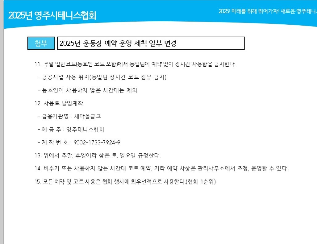 2025년도 테니스장 예약 운영 세칙 작성자안유용(드림)|작성시간25.03.24|조회수519 목록 댓글 0 글자크기 작게가 글자크기 크게가 다음검색 현재 게시글 추가 기능 열기 북마크 공유하기 신고 센터로 신고 댓글 댓글 0 댓글쓰기 답글쓰기 댓글 리스트