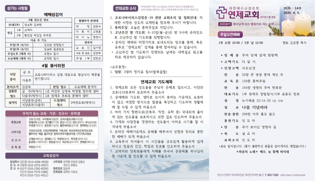* 온라인 예배와 마찬가지로 보내드리는 링크를 통해, 혹은 유투브 “연제교회” 검색을 통해 참여하실 수 있습니다.
