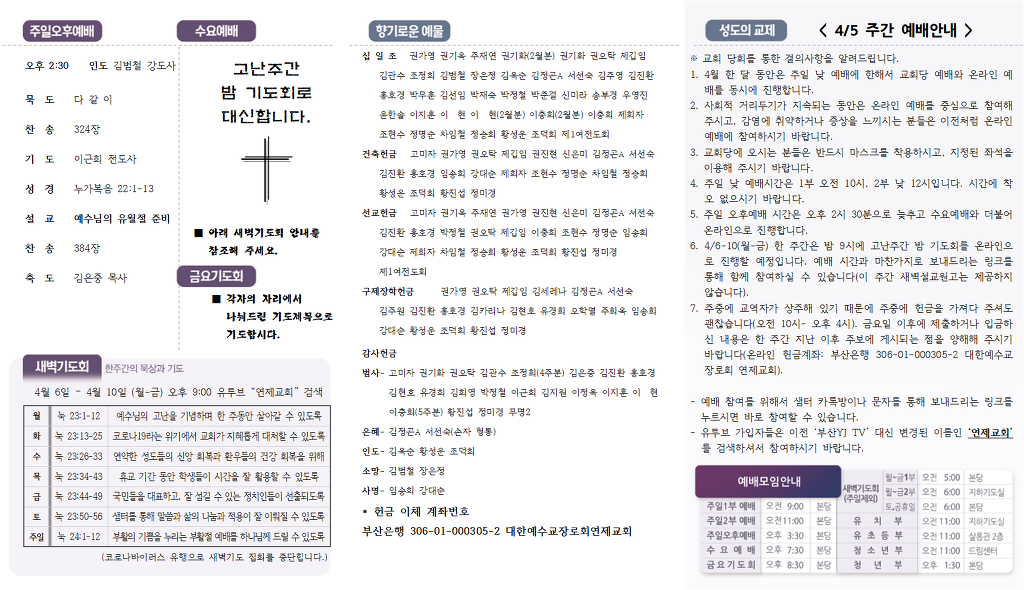 3. 고난주간 밤 기도회: 6-10일(월-금)은 밤 9시에 온라인으로 고난주간 밤 기도회를 진행합니다.
