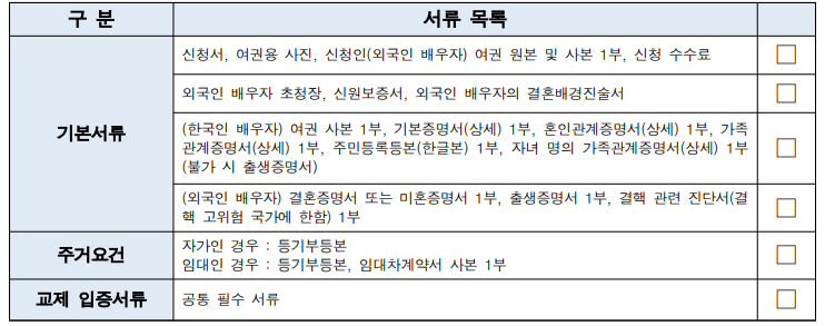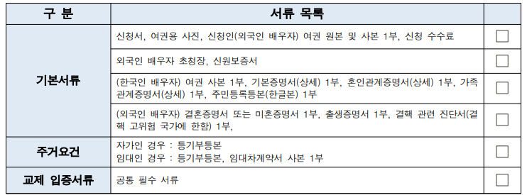 1. 위 구비서류 목록은 2022.01.03. 기준으로 작성되었습니다. 비자 심사기준의 변동에 따라 사전 예고없이 변 경될 수 있음