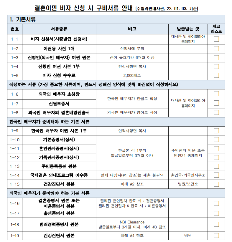 1, 필리핀 국제결혼 비자 신청 시 구비서류 안내 (주필리핀대사관, 22. 01. 03. 기준)