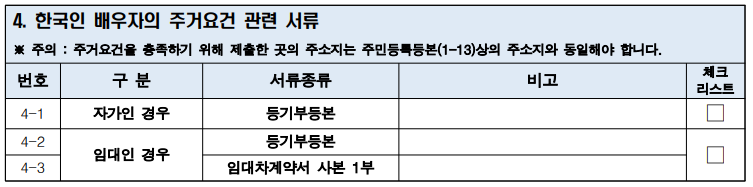 주거요건으로 제출한 주거지는 한국인 배우자 또는 한국인 배우자의 직계가족, 형제, 자매 명의로 소유 또는 임차한 곳이어야 합니다. 제3자 명의로 소유 또는 임차한 경우 원칙적으로 주거요건을 충족하지 못한 것으로 판단하나, 회사 제공 사택 등 사회통념상 인정가능한 장소인 경우 예외를 인정합니다.
