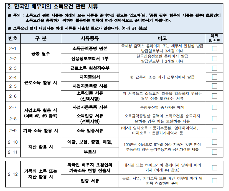 2) 원칙적으로 신청일 기준 1년 전 소득 관련 자료를 제출해야 하나 사업소득의 경우 다음 연도 5월에 소득신고가 이루어지는 특징이 있습니다. 이를 감안하여 소득금액증명상의 가장 최근 연도의 소득이 정해진 소득요건을 충족하고, 한국인 배우자가 동일한 사업을 지속하고 있다면 신청일 기준 1년 전 소득이 아니더라도 예외를 인정합니다.(단, 경우에 따라 실태조사가 실시될 수 있습니다.)