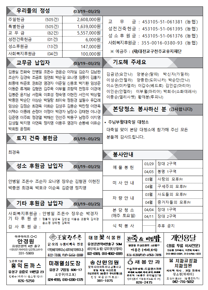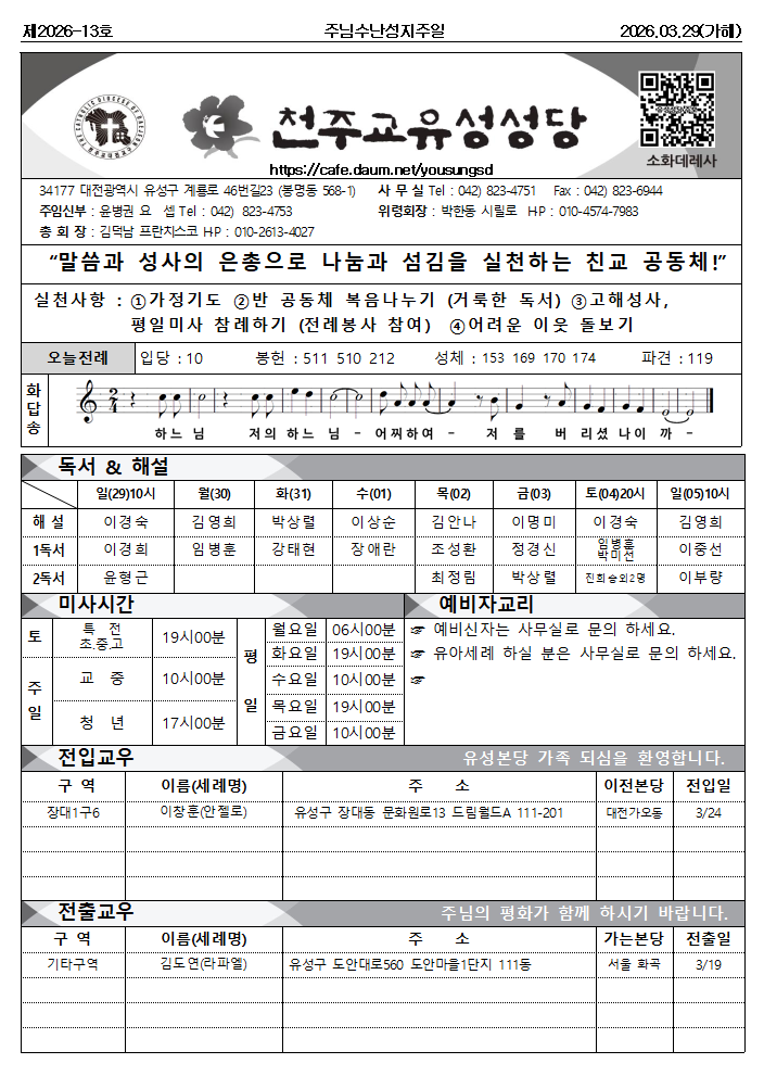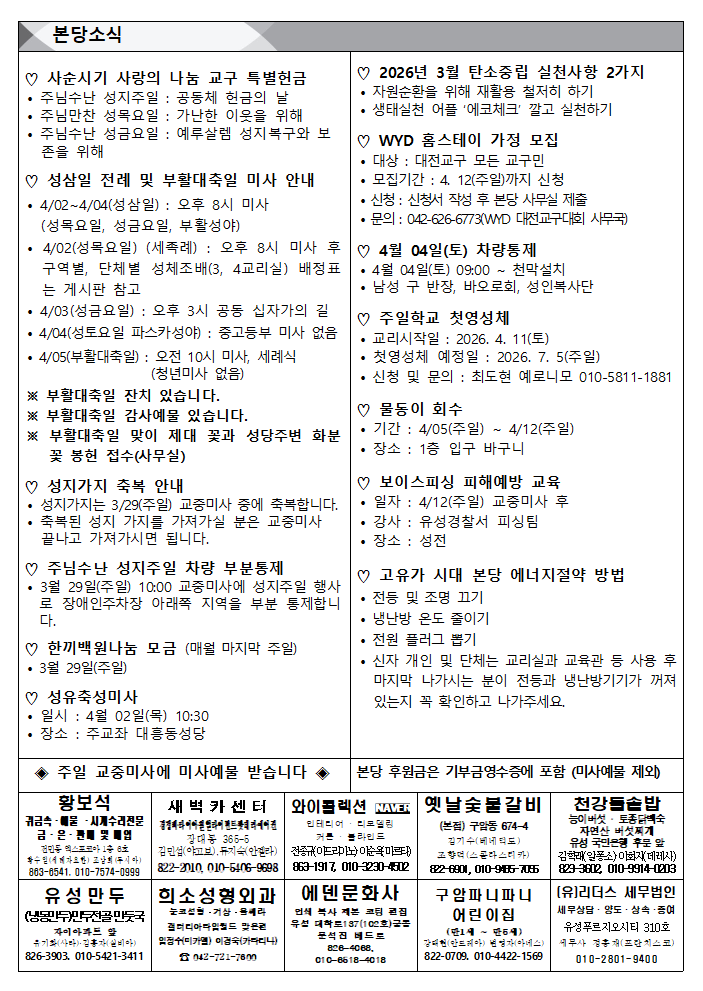 2026.03.29. 주님 수난 성지주일 주보 작성자이준해 프란치스코|작성시간26.04.04|조회수179 목록 댓글 0 글자크기 작게가 글자크기 크게가 다음검색 현재 게시글 추가 기능 열기 북마크 공유하기 신고 센터로 신고 댓글 댓글 0 댓글쓰기 답글쓰기 댓글 리스트
