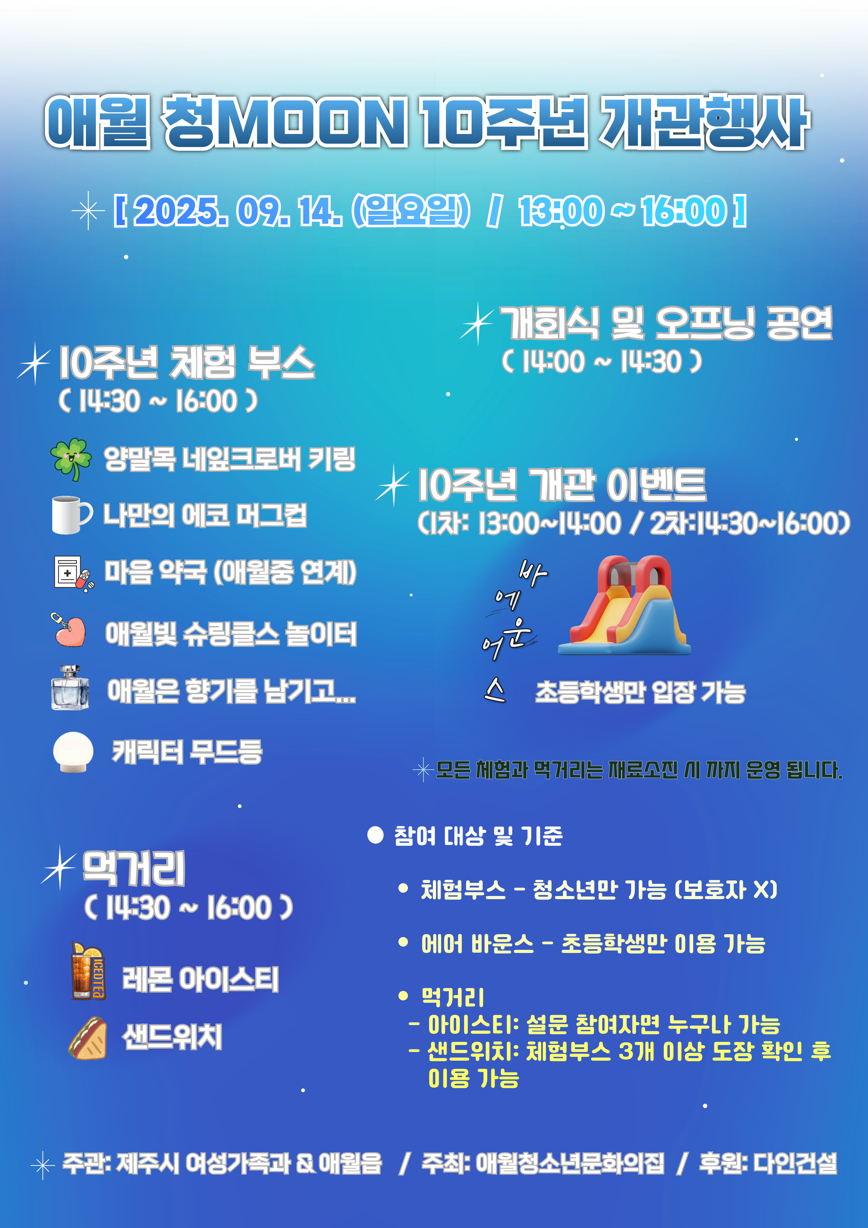 애월청소년문화의집 『애월 청 Moon 데이』 10주년 개관행사 행사안내 작성자강인범 청소년지도사|작성시간25.09.05|조회수154 목록 댓글 0 글자크기 작게가 글자크기 크게가 다음검색 현재 게시글 추가 기능 열기 북마크 공유하기 신고 센터로 신고 댓글 댓글 0 댓글쓰기 답글쓰기 댓글 리스트