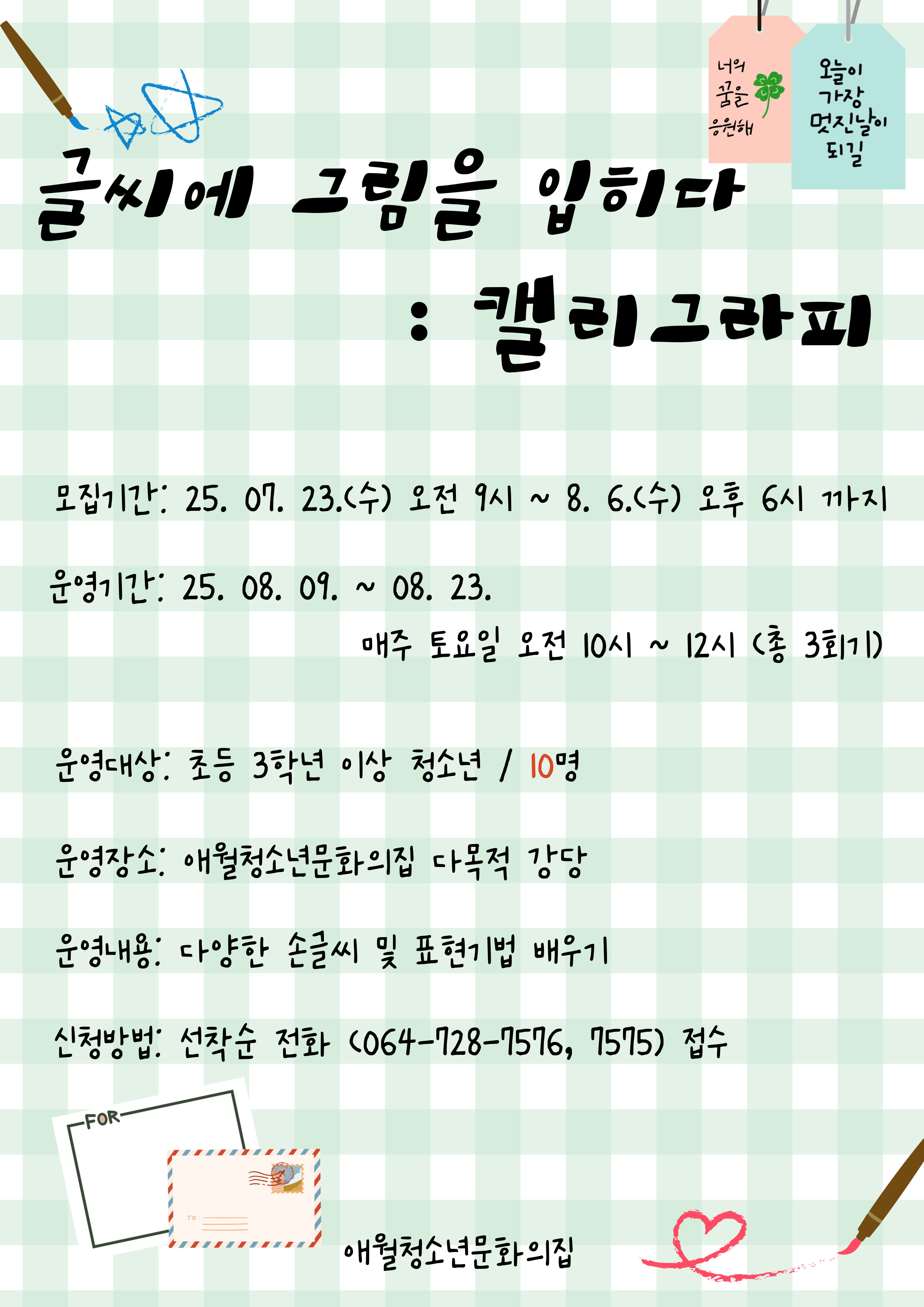 2025애월청소년문화의집 여름방학프로그램 글씨에 그림을 입히다:캘리그라피 안내 작성자램프의요정|작성시간25.07.22|조회수94 목록 댓글 1 글자크기 작게가 글자크기 크게가 다음검색 현재 게시글 추가 기능 열기 북마크 공유하기 신고 센터로 신고 댓글 댓글 1 댓글쓰기 답글쓰기 댓글 리스트 작성자램프의요정 작성자 본인 여부 작성자 | 작성시간 25.08.16 재모집공고 올립니다. 댓글 전체보기