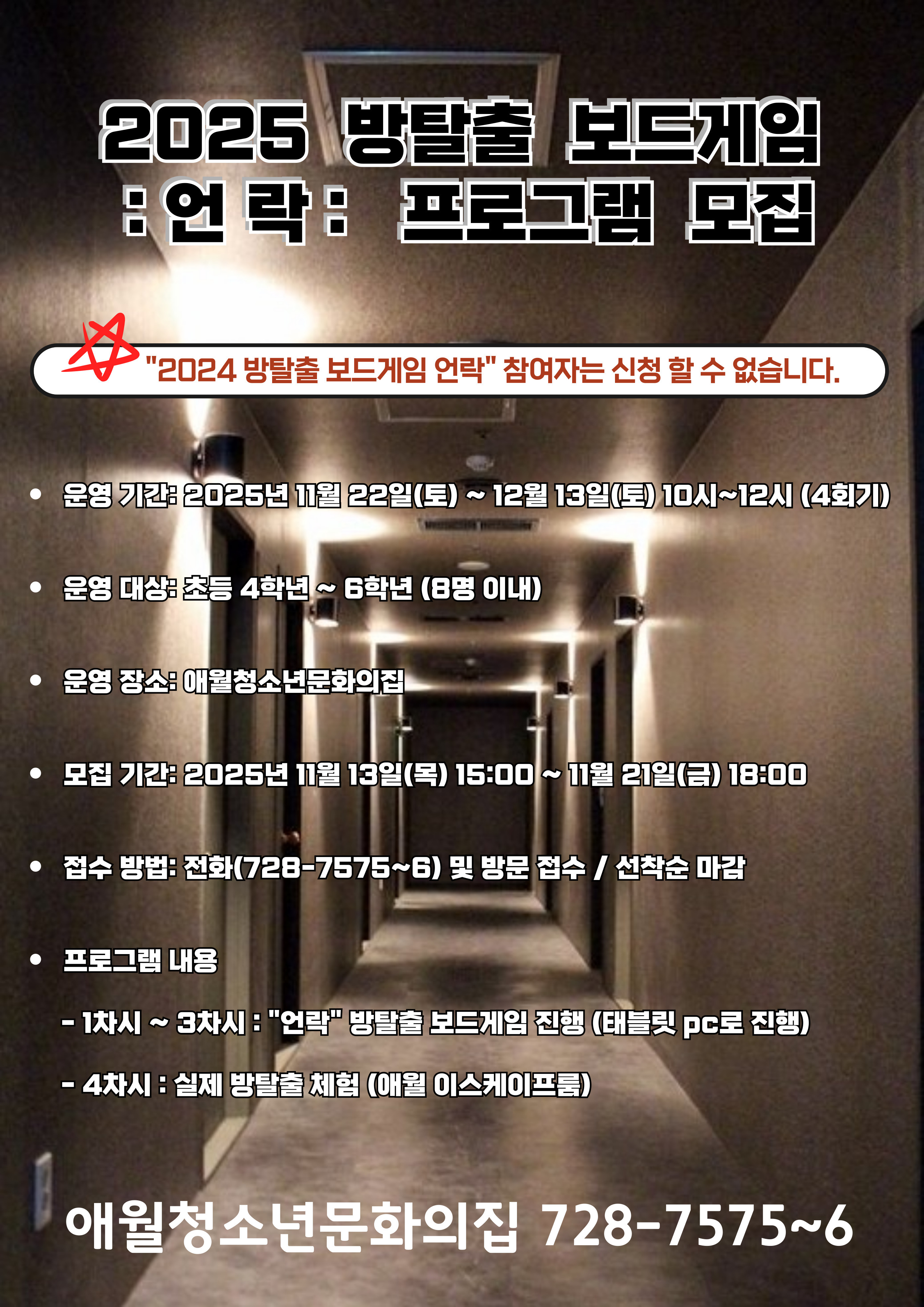 2025 애월청소년문화의집 방탈출 보드게임:언락: 프로그램 모집 작성자램프의요정|작성시간25.11.13|조회수48 목록 댓글 0 글자크기 작게가 글자크기 크게가 다음검색 현재 게시글 추가 기능 열기 북마크 공유하기 신고 센터로 신고 댓글 댓글 0 댓글쓰기 답글쓰기 댓글 리스트