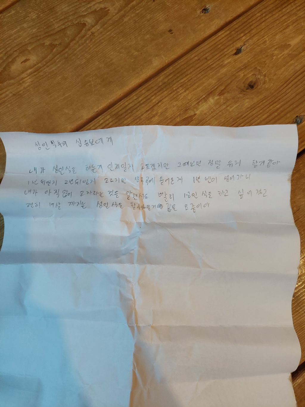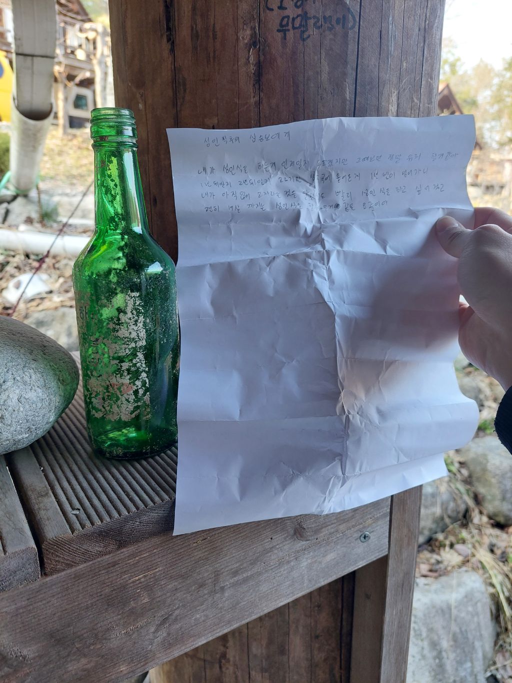 저희가 화단을 만드는 도중 소주병 안에 든 편지를 확인 했습니다. 열여봤더니 어린 시절 심승보 선배님이 미래에 자신에게 쓴 편지였습니다.