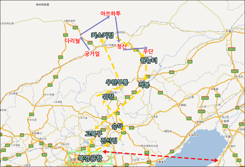 여행 도시; 북경, 고북구, 승덕, 위장, 우란부통, 커스커텅, 다리눨, 웡뉴터, 적봉