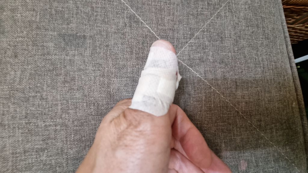 사다리가 내 엄지손가락을 탁 쳐서 다쳤다