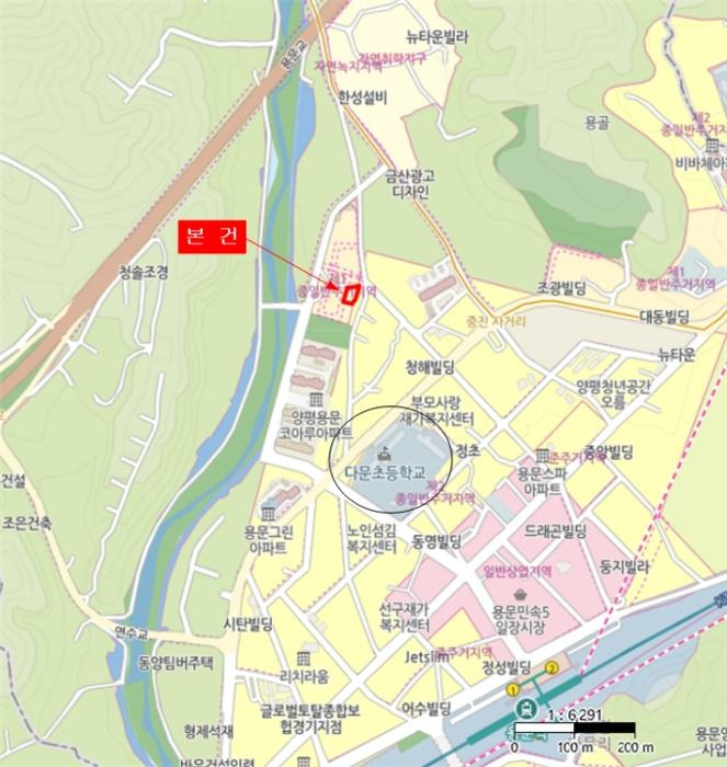 경기도 양평군 용문면 다문리 소재 "다문초등학교" 북측 직선거리 약200미터 지점에 위치