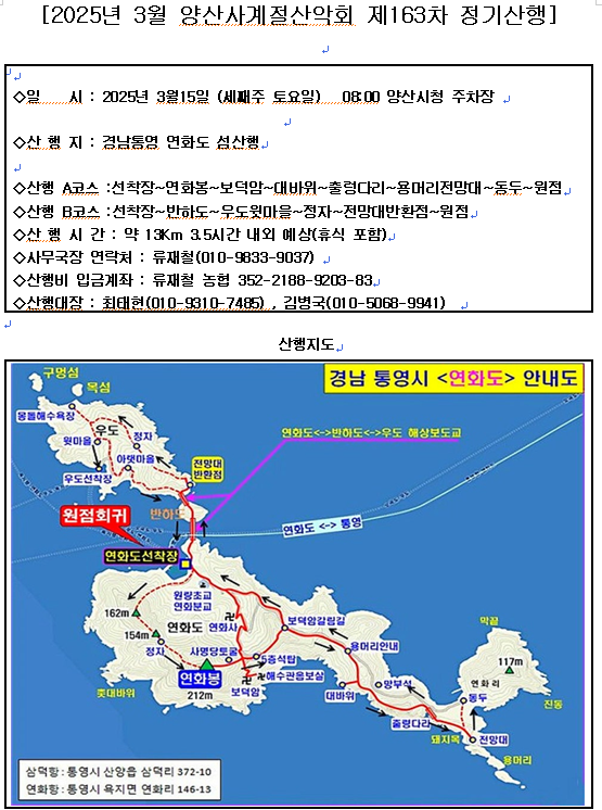 | * 출발 일자 : 2025년 3월 15일, 토요일 * 출발 장소 및 시간 : 양산 시청 주차장, 08:00 출발 * 이용 차량 : 굿투어고속관광 * 산 행 지 : 경남통영 연화도 * 산행 회비 : 정회원 50,000원/ 비회원 55,000원 (입금 계좌:농협 류재철 352-2188-9203-83) * 산행A코스 선착장~연화봉~보덕암~대바위~출렁다리~용머리전망대~동두~원점 13Km 3.5시간 내외 예상(휴식 포함) 산행B코스( 6㎞) :선착장~반하도~우도윗마을~정자~전망대반환점~원점 (산행 코스는 여건에 따라 변경될수 있습니다) * 준 비 물 : 물, 스틱, 보온장비, 개인 기호품,여벌옷등... * 기타사항 - 본회는 친목을 도모하는 비영리 단체로서 모든 행사 및 산행의 안전사고에 대하여 민,형사상의 책임을 지지 않습니다. - 산행 출발 및 하산 시간을 필히 준수해 주십시요. - 산행지 및 좌석은 변경 될 수 있습니다. - 참가자는 상기(기타)사항을 동의한 것으로 간주합니다. |