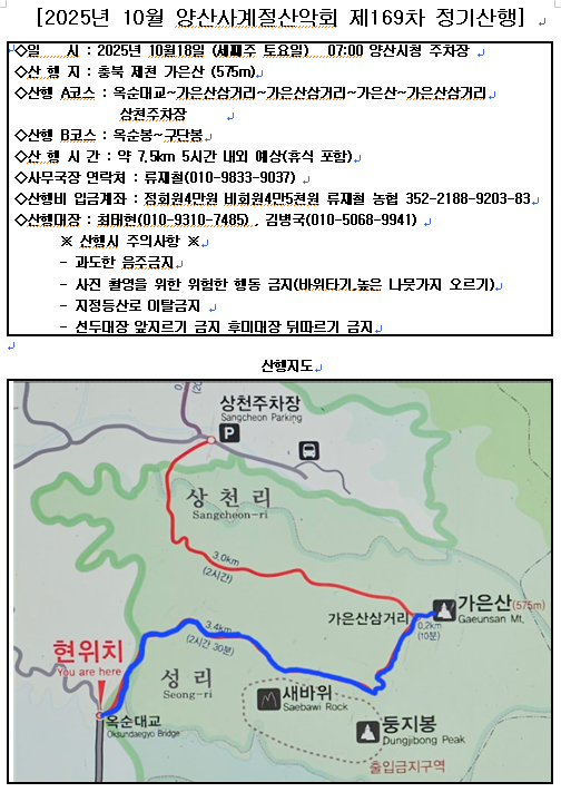 | * 출발 일자 : 2025년 10월 18, 토요일 * 출발 장소 및 시간 : 양산 시청 주차장, 07:00 출발 * 이용 차량 : 굿투어고속관광 * 산 행 지 : 충북제천 가은산 (575m) * 산행 회비 : 정회원 40,000원/ 비회원 45,000원 (입금 계좌:농협 류재철 352-2188-9203-83) * 산행 A코스 : 옥순대교~가은산삼거리~가은산삼거리~가은산~가은산삼거리~상천주차장 약 7.5km 5시간 내외 예상(휴식 포함) 산행B코스 : 옥순봉~구단봉 약 3.5km 3시간 내외 예상(휴식 포함) (산행 코스는 여건에 따라 변경될수 있습니다) * 준 비 물 : 물, 스틱, 보온장비, 개인 기호품,여벌옷등... ※ 산행시 주의사항 ※ - 과도한 음주금지 - 사진 촬영을 위한 위험한 행동 금지(바위타기,높은 나뭇가지 오르기) - 지정등산로 이탈금지 - 선두대장 앞지르기 금지 후미대장 뒤따르기 금지 * 기타사항 - 본회는 친목을 도모하는 비영리 단체로서 모든 행사 및 산행의 안전사고에 대하여 민,형사상의 책임을 지지 않습니다. - 산행 출발 및 하산 시간을 필히 준수해 주십시요. - 산행지 및 좌석은 변경 될 수 있습니다. - 참가자는 상기(기타)사항을 동의한 것으로 간주합니다. |
