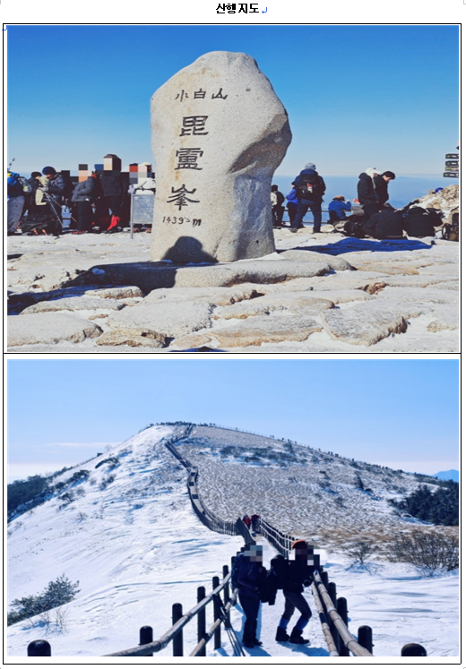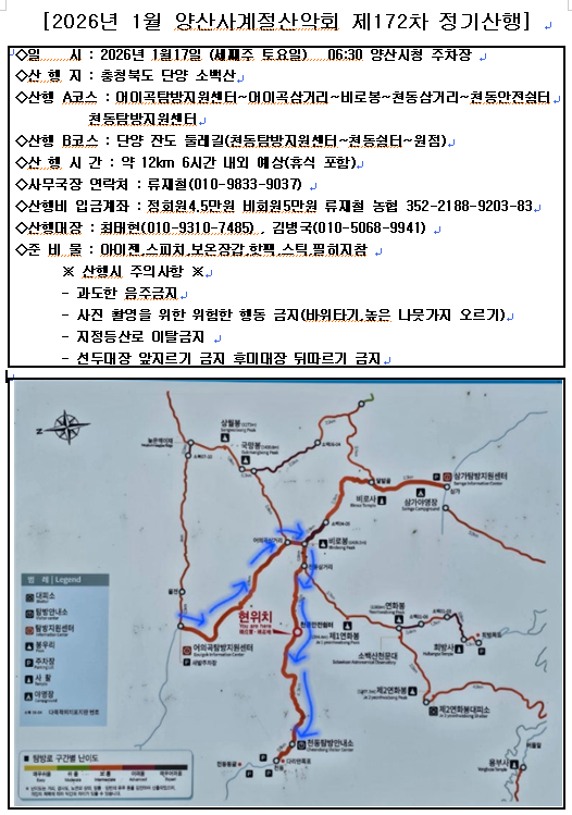 | * 출발 일자 : 2026년 1월 17, 토요일 * 출발 장소 및 시간 : 양산 시청 주차장, 06:30 출발 * 이용 차량 : 싱싱고속관광 * 산 행 지 : 충북단양 소백산(1,439m) * 산행 회비 : 정회원 45,000원/ 비회원 50,000원 (입금 계좌:농협 류재철 352-2188-9203-83) * 산행 A코스 : 어이곡탐방지원센터~어이곡삼거리~비로봉~천동삼거리~천동안전쉼터 천동탐방지원센터 약 12km 6시간 내외 예상(휴식 포함) 산행B코스 : 단양 잔도 둘레길(천동탐방지원센터~천동쉼터~원점) 약 5km 2시간 내외 예상(휴식 포함) (산행 코스는 여건에 따라 변경될수 있습니다) * 준 비 물 : 아이젠,스피치,핫팩,물, 스틱, 보온장비, 개인 기호품,여벌옷등... 개인도시락 및 간식지참 ※ 산행시 주의사항 ※ - 과도한 음주금지 - 사진 촬영을 위한 위험한 행동 금지(바위타기,높은 나뭇가지 오르기) - 지정등산로 이탈금지 - 선두대장 앞지르기 금지 후미대장 뒤따르기 금지 * 기타사항 - 본회는 친목을 도모하는 비영리 단체로서 모든 행사 및 산행의 안전사고에 대하여 민,형사상의 책임을 지지 않습니다. - 산행 출발 및 하산 시간을 필히 준수해 주십시요. - 산행지 및 좌석은 변경 될 수 있습니다. - 참가자는 상기(기타)사항을 동의한 것으로 간주합니다 |