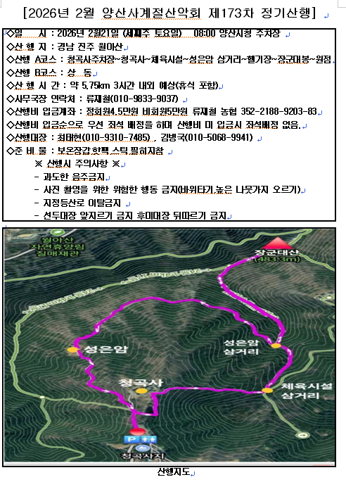 | * 출발 일자 : 2026년 2월 21, 토요일 * 출발 장소 및 시간 : 양산 시청 주차장, 06:30 출발 * 이용 차량 : 싱싱고속관광 * 산 행 지 : 경남 진주 월아산(482m) * 산행 회비 : 정회원 45,000원/ 비회원 50,000원 (입금 계좌:농협 류재철 352-2188-9203-83) * 산행 A코스 : 청곡사주차장~청곡사~체육시설~성은암 삼거리~헬기장~장군대봉~원점 약 5.75km 3시간 내외 예상(휴식 포함) 산행B코스 : 청곡사주차장~청곡사~체육시설~성은암 삼거리~헬기장~장군대봉~원점 약 5.75km 3시간 내외 예상(휴식 포함) (산행 코스는 여건에 따라 변경될수 있습니다) * 준 비 물 : 핫팩,물, 스틱, 보온장비, 개인 기호품,여벌옷등... 개인 간식지참 ※ 산행시 주의사항 ※ - 과도한 음주금지 - 사진 촬영을 위한 위험한 행동 금지(바위타기,높은 나뭇가지 오르기) - 지정등산로 이탈금지 - 선두대장 앞지르기 금지 후미대장 뒤따르기 금지 * 기타사항 - 본회는 친목을 도모하는 비영리 단체로서 모든 행사 및 산행의 안전사고에 대하여 민,형사상의 책임을 지지 않습니다. - 산행 출발 및 하산 시간을 필히 준수해 주십시요. - 산행지 및 좌석은 변경 될 수 있습니다. - 참가자는 상기(기타)사항을 동의한 것으로 간주합니다 |