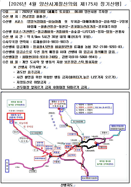 | 출발 일자 : 2026년 4월 18, 토요일 * 출발 장소 및 시간 : 양산 시청 주차장, 06:00 출발 * 이용 차량 : 싱싱고속관광 * 산 행 지 : 전남영암 월출산(809m) * 산행 회비 : 정회원 45,000원/ 비회원 50,000원 (입금 계좌:농협 류재철 352-2188-9203-83) * 산행 A코스 :영암녹암마을~하늘아래 첫 부처길~마애여래좌상~삼층석탑~구정봉 바람재 ~월출산정상~통천문~경포대능선삼거리~경포대주차장 약 8.5km 5시간 30분 내외 예상(휴식 포함) 산행B코스 :기찬렌드~돌고래바위~귀뜰바위~솔숲길~나무다리~정자~탐동~천황 약 3km 3시간 내외 예상(휴식 포함) (산행 코스는 여건에 따라 변경될수 있습니다) * 준 비 물 : 스틱,개인등산장비지참 및 개인 도시락 및 기호품,여벌옷등... 개인 간식지참 ※ 산행시 주의사항 ※ - 과도한 음주금지 - 사진 촬영을 위한 위험한 행동 금지(바위타기,높은 나뭇가지 오르기) - 지정등산로 이탈금지 - 선두대장 앞지르기 금지 후미대장 뒤따르기 금지 * 기타사항 - 본회는 친목을 도모하는 비영리 단체로서 모든 행사 및 산행의 안전사고에 대하여 민,형사상의 책임을 지지 않습니다. - 산행 출발 및 하산 시간을 필히 준수해 주십시요. - 산행지 및 좌석은 변경 될 수 있습니다. - 참가자는 상기(기타)사항을 동의한 것으로 간주합니다 |